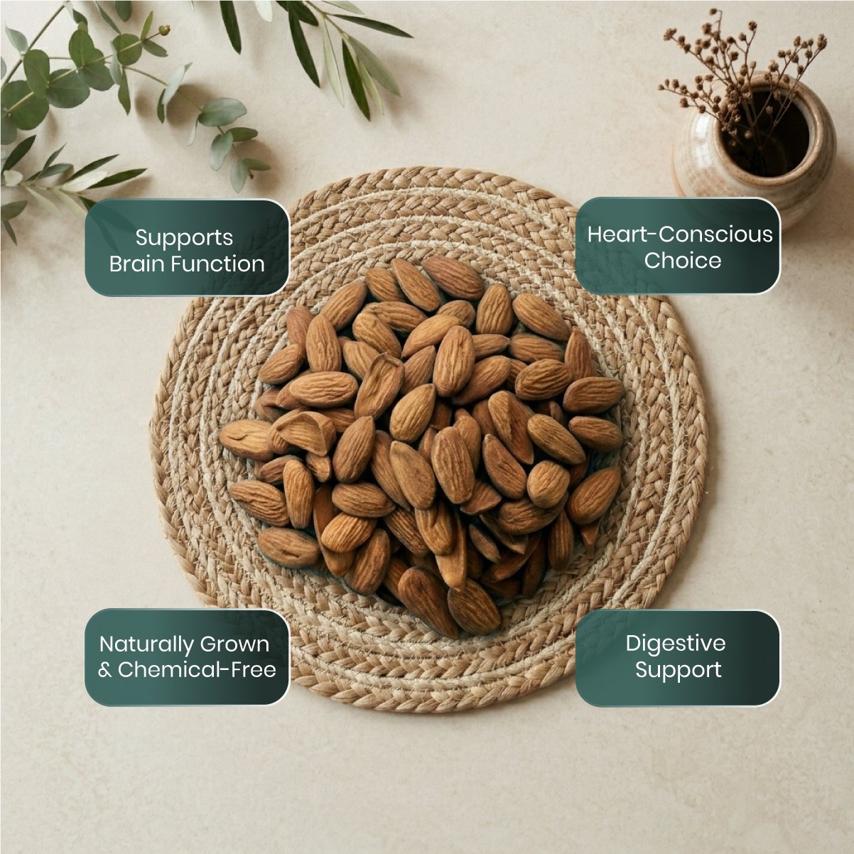 These premium almonds are naturally rich in essential nutrients that contribute to overall vitality and balanced daily nourishment.